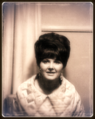 Mom just got her "Beehive Hair Style" done earlier that day, and she wanted a photo. Back then, the camera to use for a quick photograph was the Black & White Polaroid Camera. That missed out on color, but it still holds the beauty of Mom. Mom had a dream of being a Fashion Designer. Here, Grandma was right there getting ready to take the photo, and Mom said she wanted to switch her "Golden Robe" around to put the collar in front with no buttons. Well, as Grandma was a Specialty Tailor, she thought this was a little original; questioning Mom about her choice, but she took the photo and now we have it to talk about it. So here's the first photo...the one where Mom had the front of her "Designer Dress" - as no one was supposed to know - she's really wearing a beautiful robe...I remember this robe, by the way. It was very beautiful.