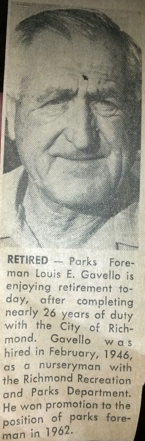 The Parks Department at the City of Richmond threw a grand celebration for him. I remember as a child, we had many different people visit from the City of Richmond; different co-workers of Grandpa's; I had always wondered why they used to refer to Grandpa as "The Mayor".