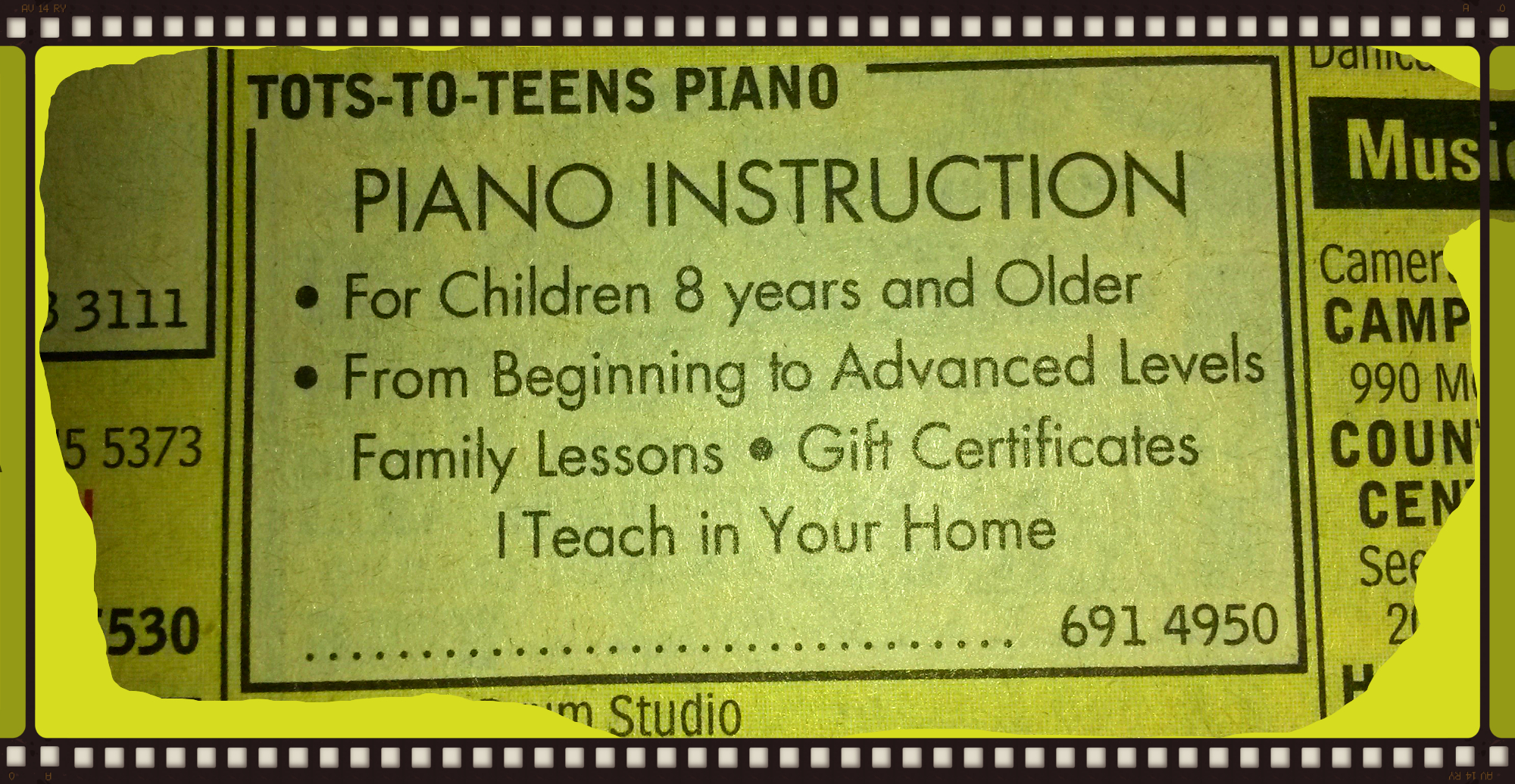This was one of the best ways to advertise during this time-period. The only problem is, the phone book sales representative indicated only the words 'Piano Instruction' could fit, due to the timing of when I contacted them. They had many advertisements already in place, and only had this size space available at the time. So I opted to get my basic information; leading to missing out on the full title of 'Tots-To-Teens Piano & Voice Instruction'. A minor issue, but I felt it was better to have something rather than nothing in the phone book.